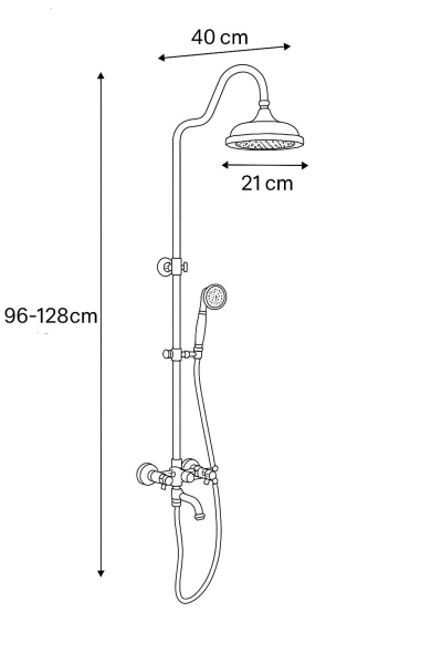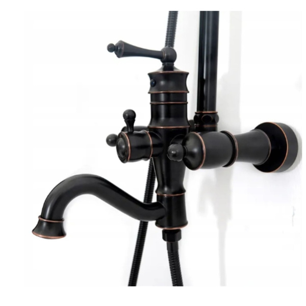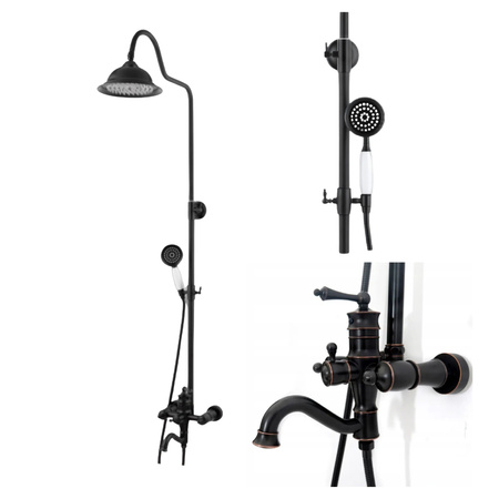 Sprchová sada v retro verzi, která se vyznačuje nejvyšší kvalitou výroby. Baterie je vyrobena z mosazi zesílené dalšími vrstvami černého matu. To zdůrazňuje její krásný vzhled a zvyšuje odolnost vůči vnějším vlivům. Keramická kartuše je zárukou bezproblémového provozu po dlouhou dobu. Sprchová hlavice má možnost nastavení ve všech rovinách, což zajišťuje efektivní a velmi pohodlné dodávání vody. Vývod pro sprchu a přiložená ruční sprcha rozšiřují možnosti této sprchové baterie. Produkt je vybaven kompletní montážní sadou.