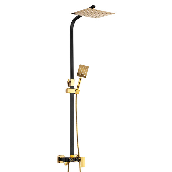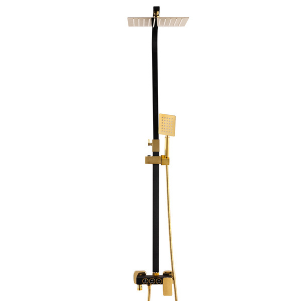 Sada sprchová nástěnná v prémiové verzi, která se vyznačuje nejvyšší kvalitou výroby. Baterie je vyrobena z mosazi, pokryta černým matem a lesklým zlatem. Keramická kartuše je zárukou bezporuchového provozu na dlouhou dobu. Baterie s dešťovou sprchou je navržena v moderním stylu.