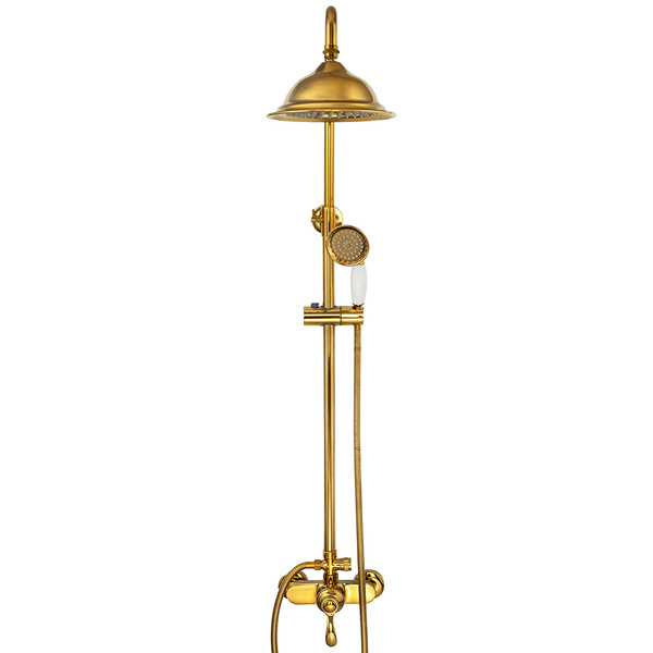 Nástěnná sprchová sada ve verzi Premium, která se vyznačuje nejvyšší kvalitou výroby. Baterie je vyrobena z mosazi a celá sada je pokryta lesklou zlatou vrstvou. Keramická kartuše je zárukou bezporuchového provozu po dlouhou dobu. Baterie s dešťovou sprchou je navržena ve stylu RETRO.