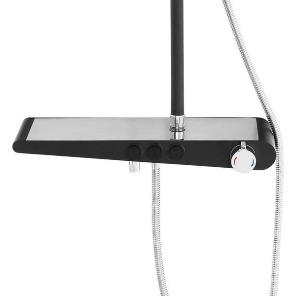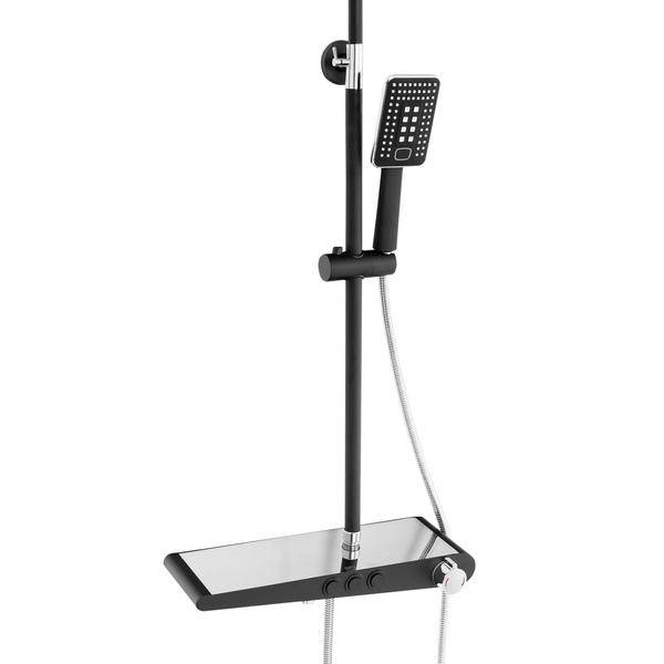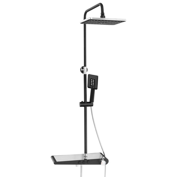 Nástěnná sprchová sada černá s dešťovou sprchou a poličkou – moderní styl a funkčnost