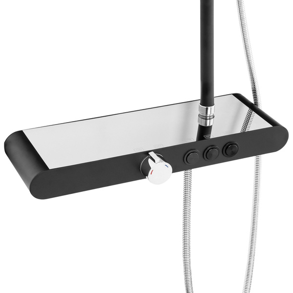 Nástěnná sprchová sada černá s dešťovou sprchou a poličkou – moderní styl a funkčnost